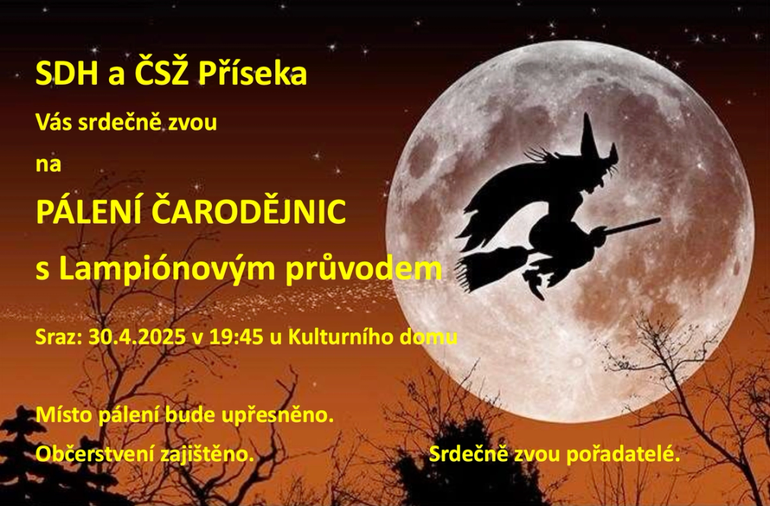 srdečně vás zveme na tradiční pálení čarodějnic s lampiónovým průvodem, které se uskuteční v úterý 30. dubna v Přísece.