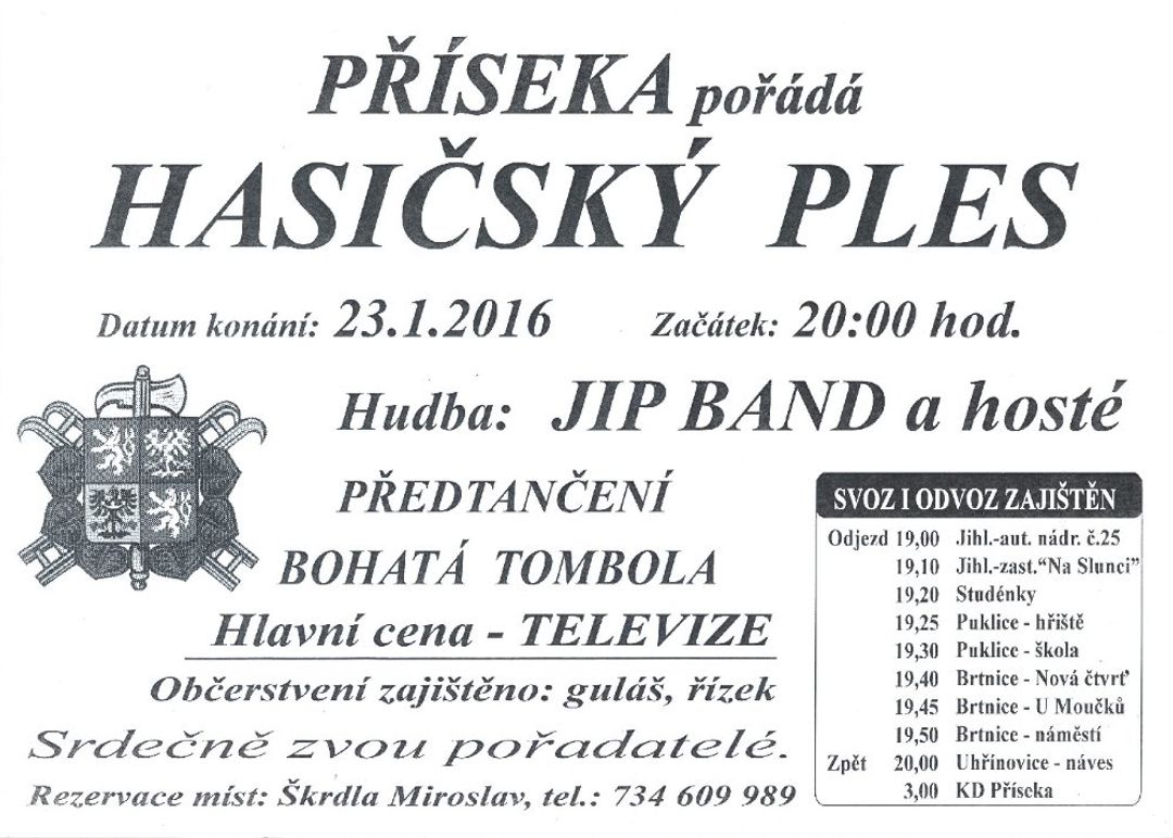Dne 23.1.2016 se koná tradiční Hasičský ples. Čeká vás bohatá tombola, výborné občerstvení a skvělá zábava. K tanci bude hrát kapela JIP Band. Všichni jste srdečně zváni.