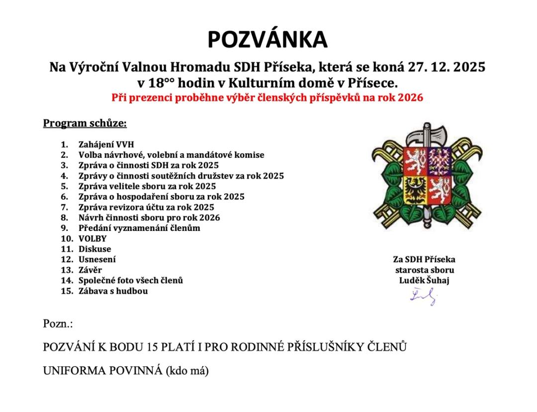 Sbor dobrovolných hasičů Příseka srdečně zve všechny své členy na Výroční Valnou Hromadu, která proběhne 27. prosince 2025 od 18:00 v Kulturním domě v Přísece. Společně se ohlédneme za uplynulým rokem, podělíme se o výsledky, plány i úspěchy a připomeneme si práci, která drží náš sbor pohromadě.
